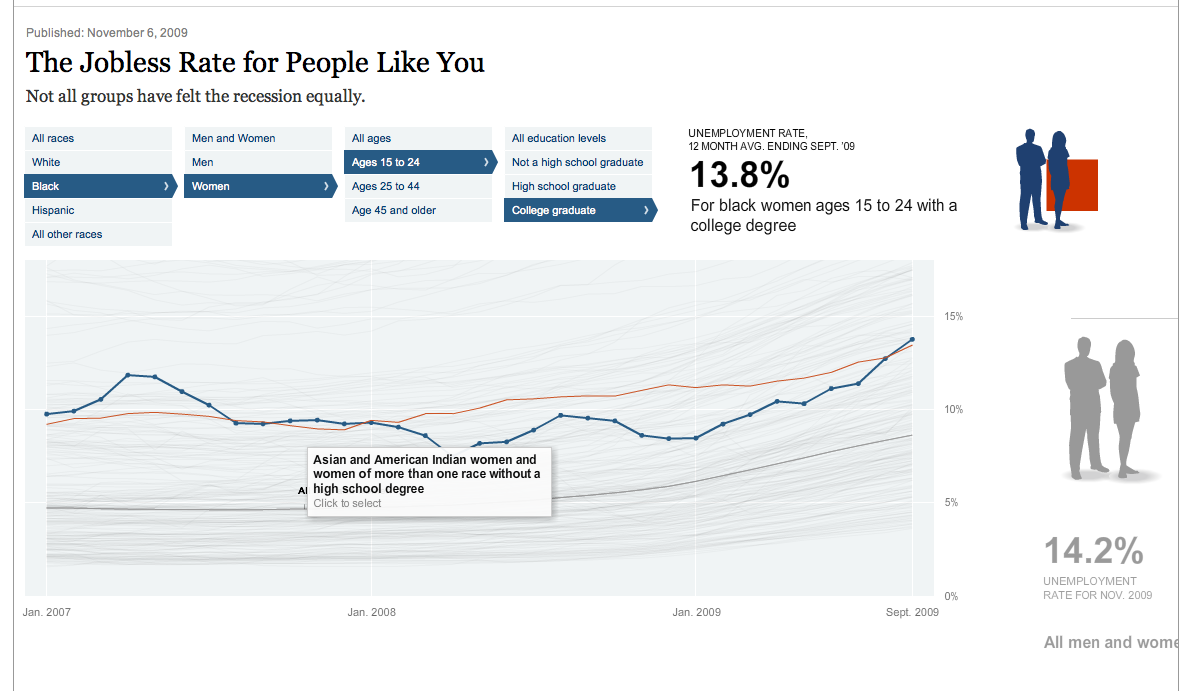 The New York Times created an interactive chart that personalized the crisis in the wake of the Great Recession. By filtering unemployment rates by age, race, education, and sex, readers could see how the economic downturn affected demographics like their own, driving home the reality of the crisis.