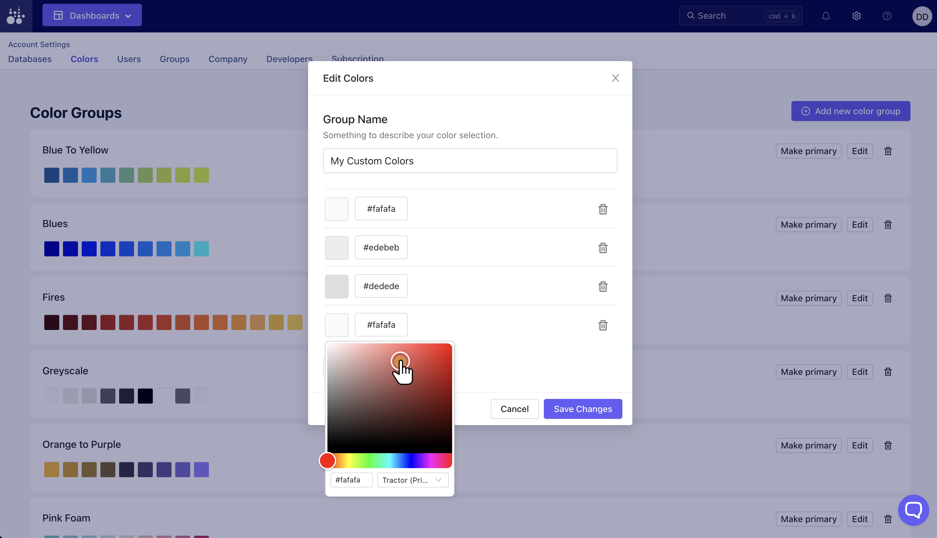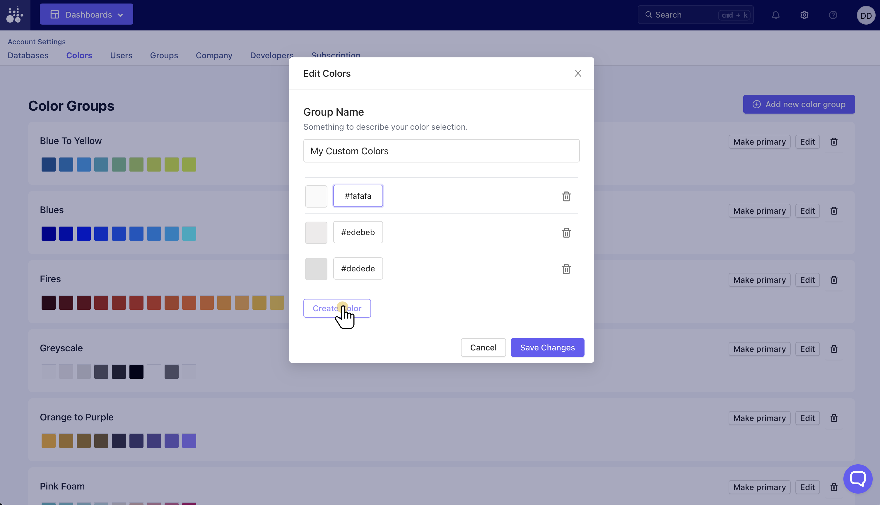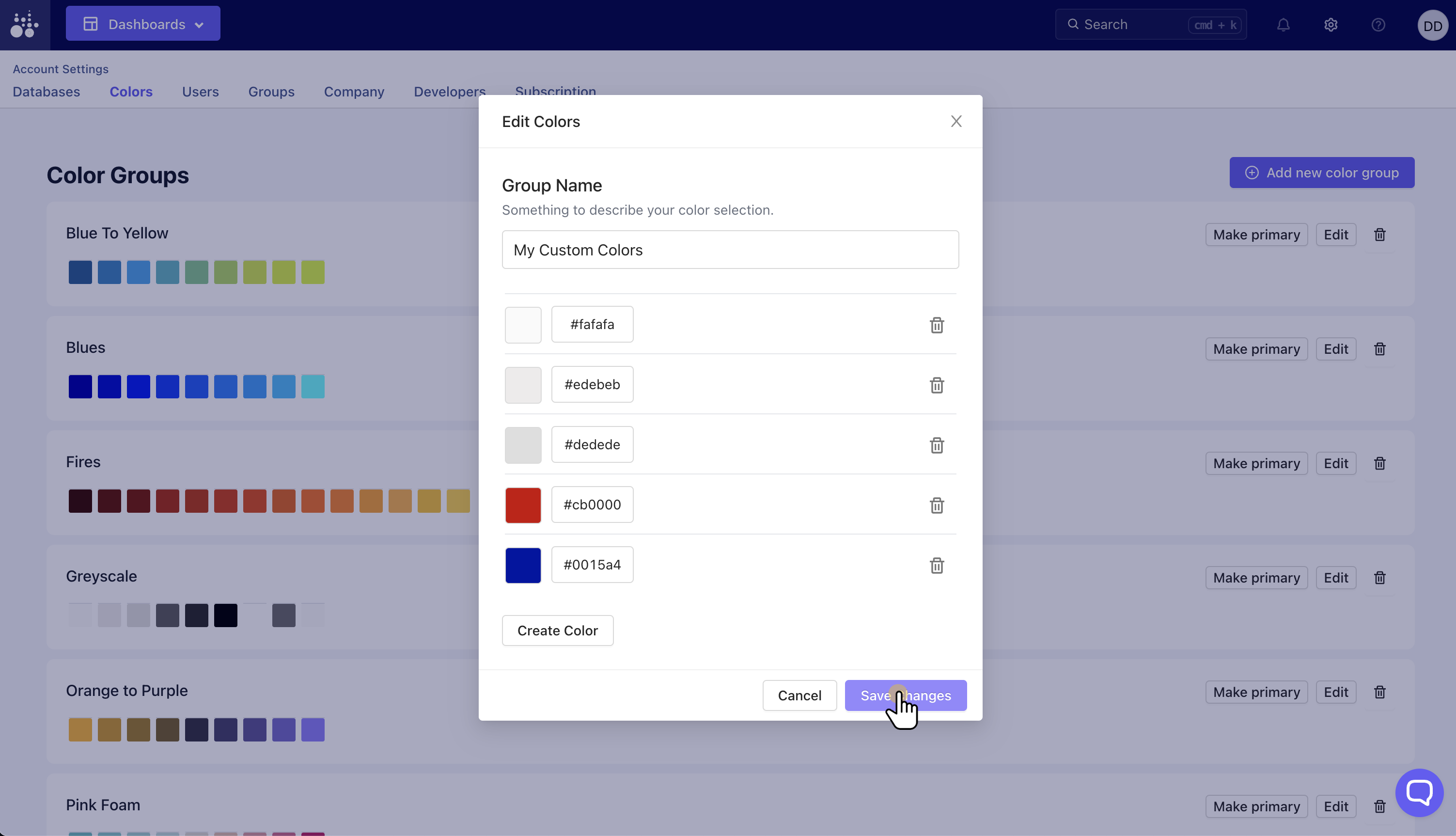 Once you have all the colors you need in your palette, go ahead and Save changes to add your new color group. Color Groups are account wide so anyone with access can use the presets.