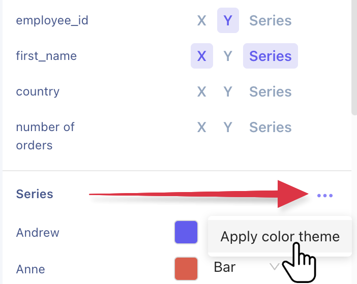 In the Series settings open the ellipsis menu and Apply color theme. This opens a modal with all available themes.