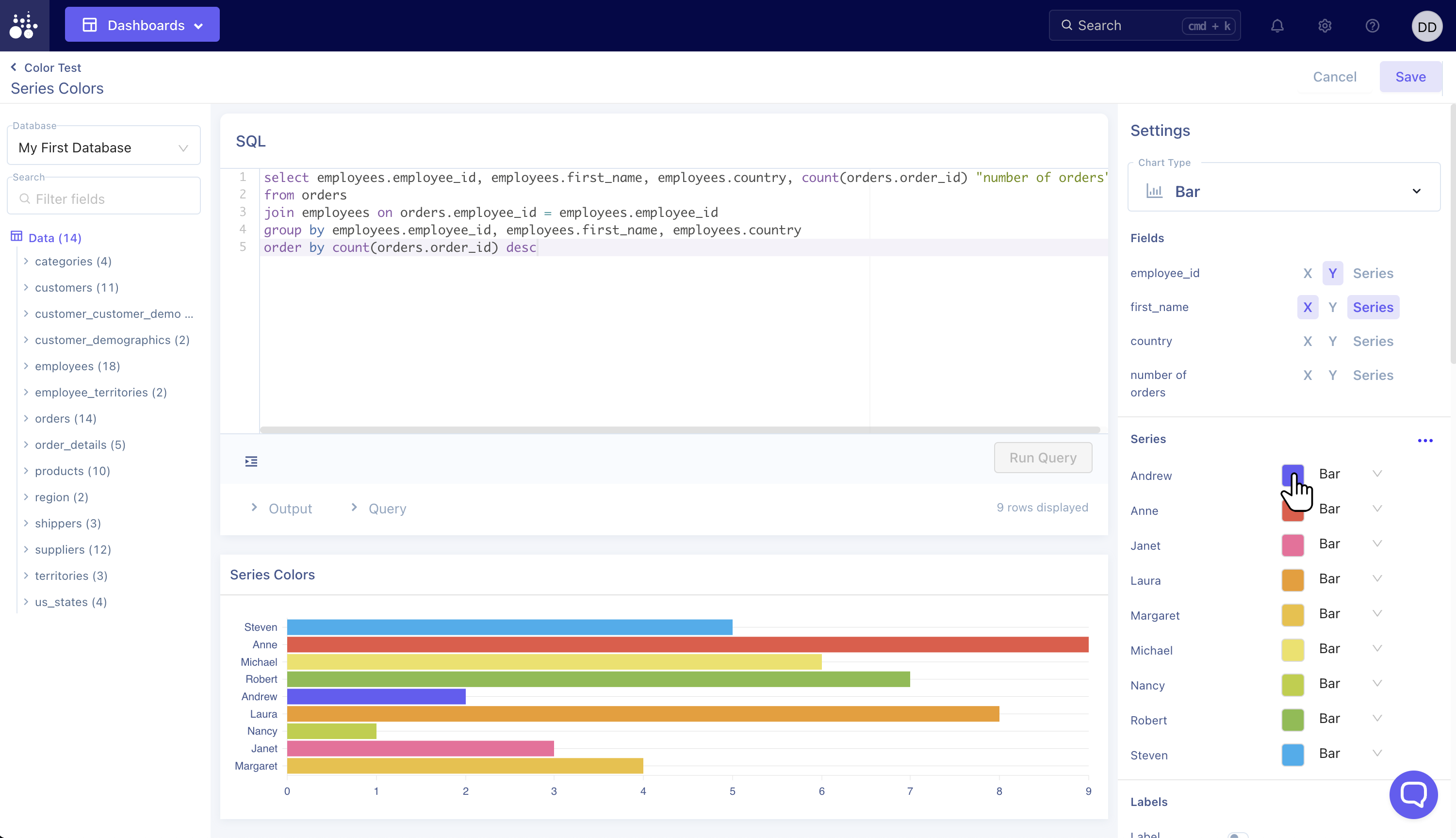Select the theme you wish to apply and the modal closes as the Series auto updates with the selected colors.